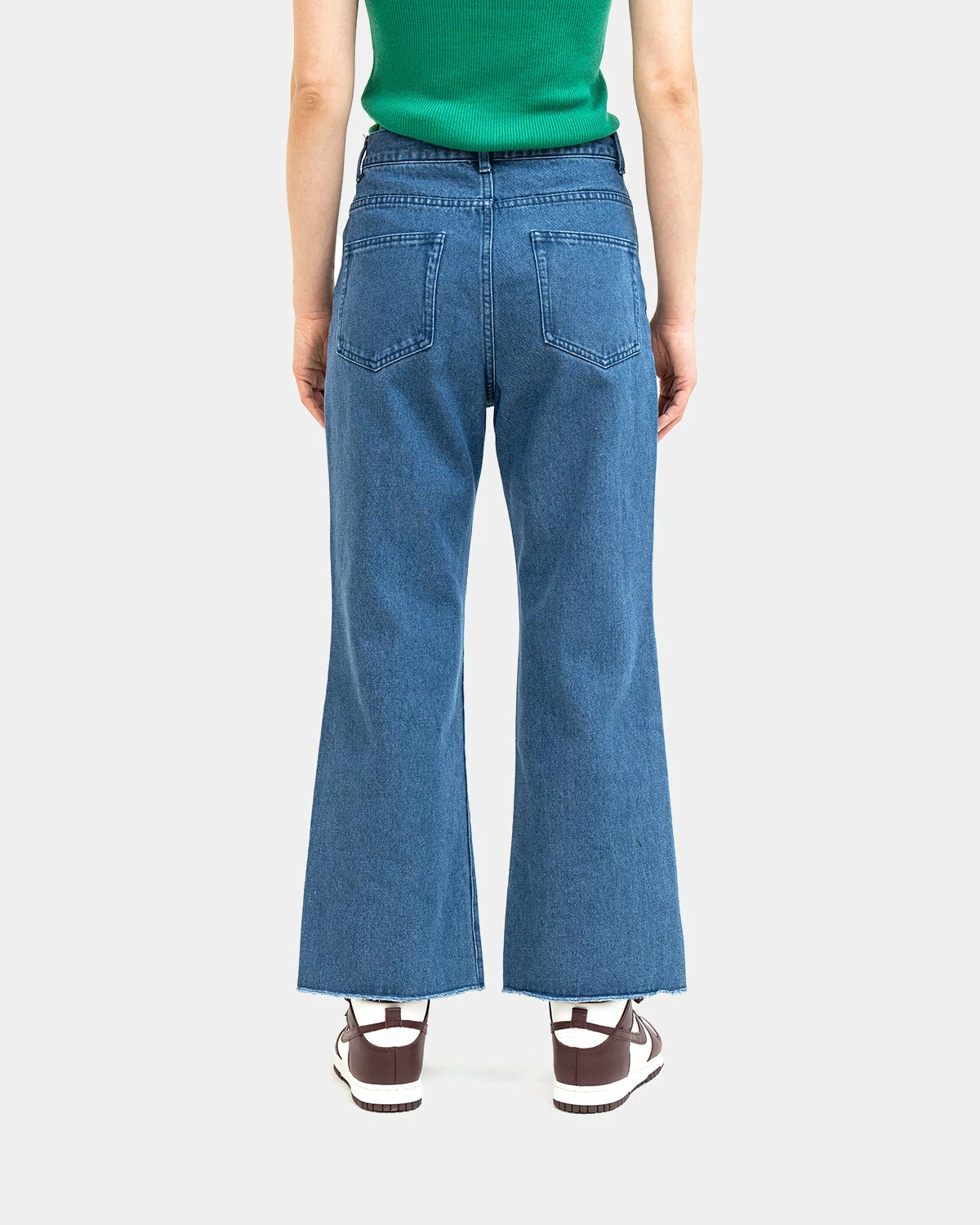 Denim pants using the same denim material as the MA-1 denim jacket. The point is the straight silhouette that is not too thick. The uncut hem gives it a casual look.