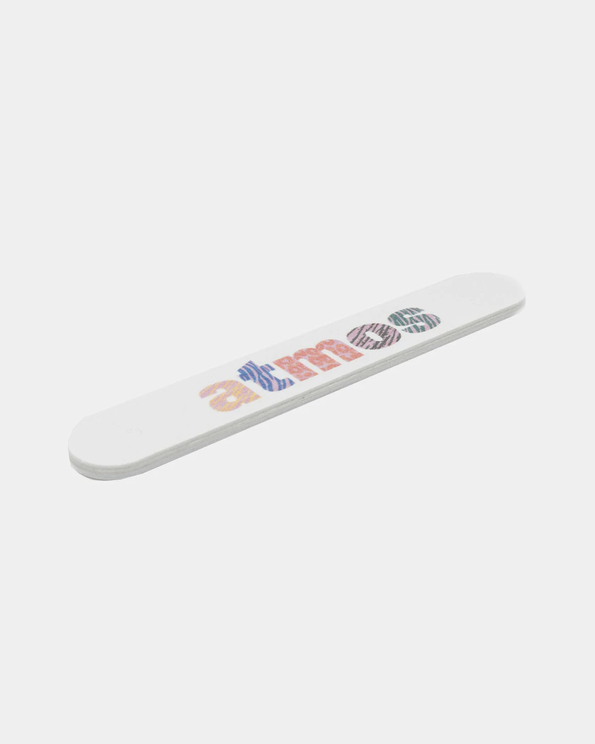 File your nails in style with atmos branded nail file. This white nail file is designed with the atmos logo in classic animal print colors.