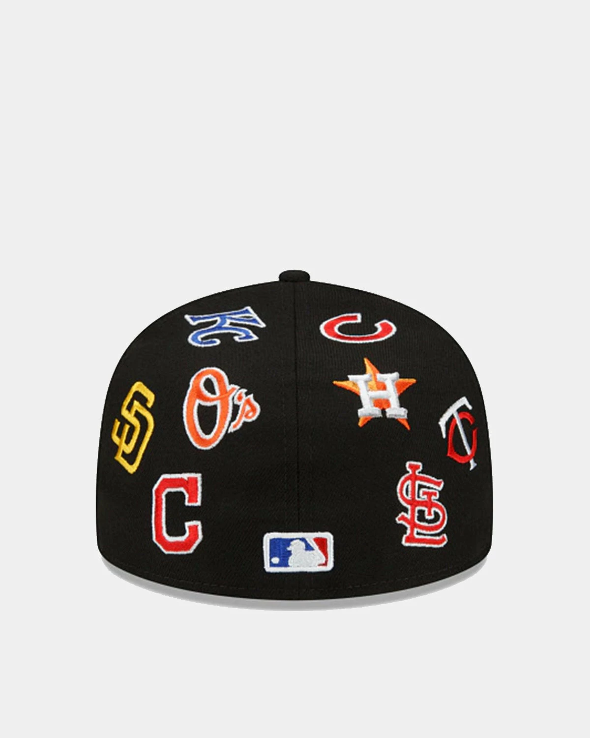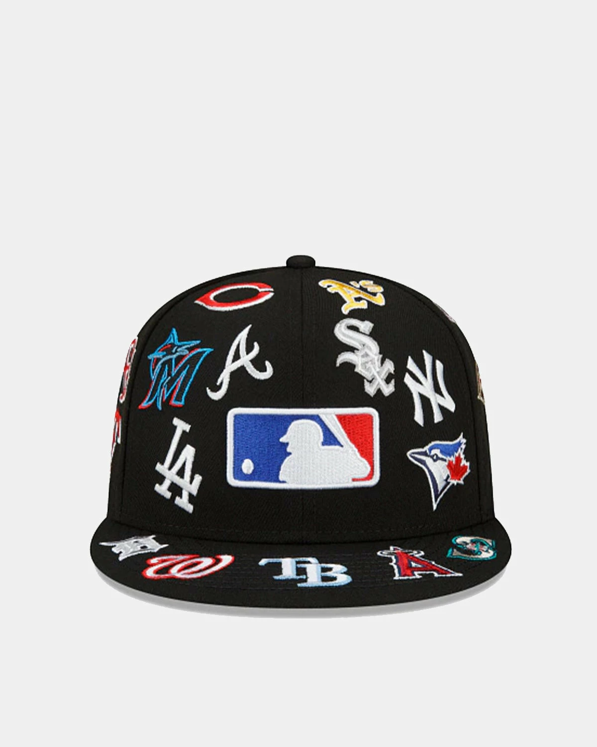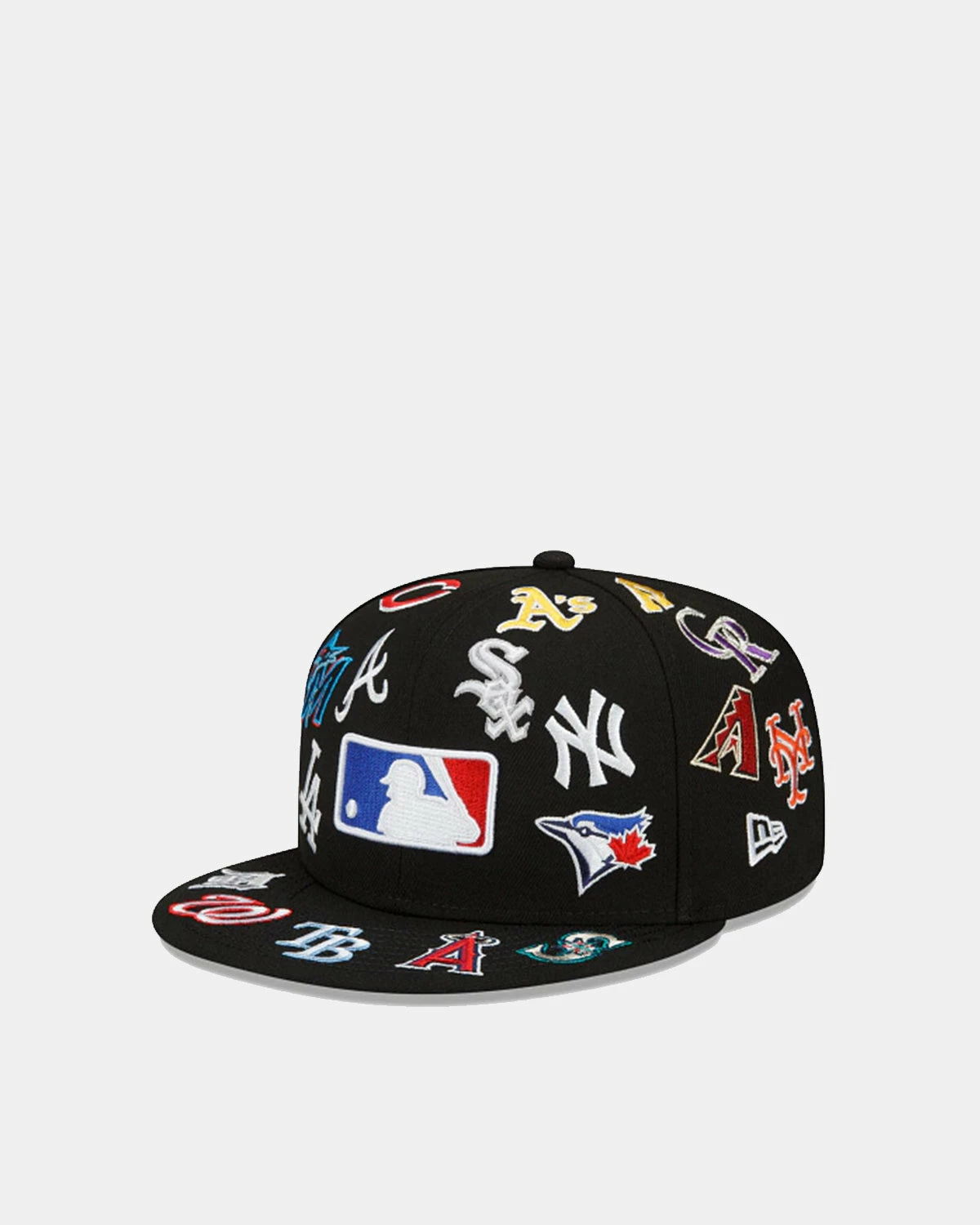 Back from the vault, the MLB All Over 59FIFTY Fitted Cap features the Official MLB Batterman logo embroidered at the front panels with all 30 team logos embroidered throughout the crown and visor with a smaller MLB Batterman logo at the rear.