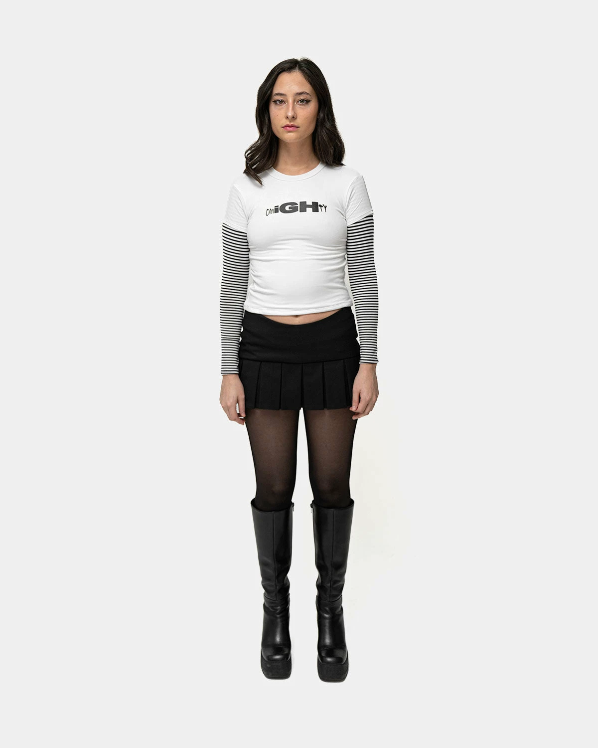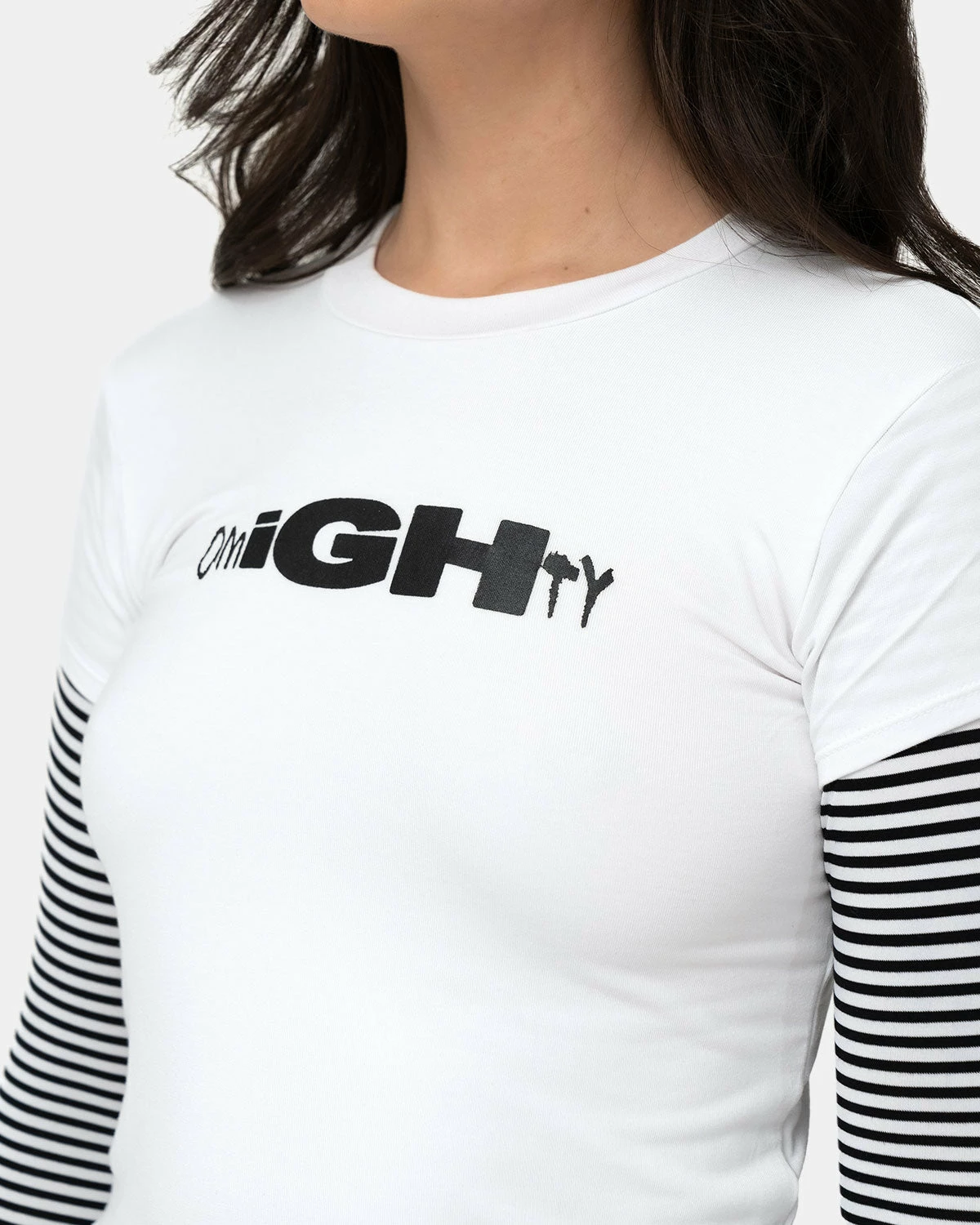 An obviously cool OMIGHTY logo, like cooler than all your other logo tees. This is a cropped baby tee with attached striped sleeves