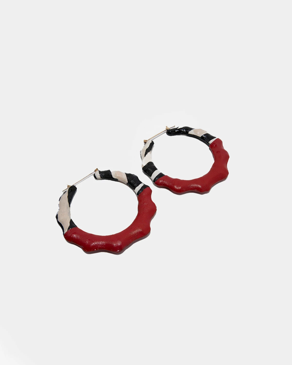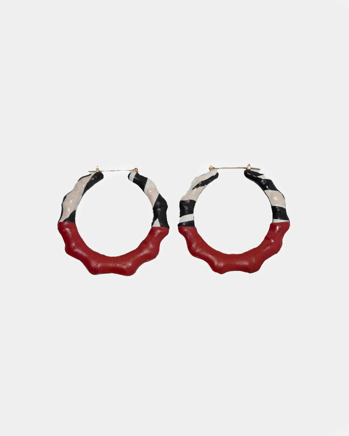 Classic large bamboo earrings reimagined, handwrapped in red and black and white leather.