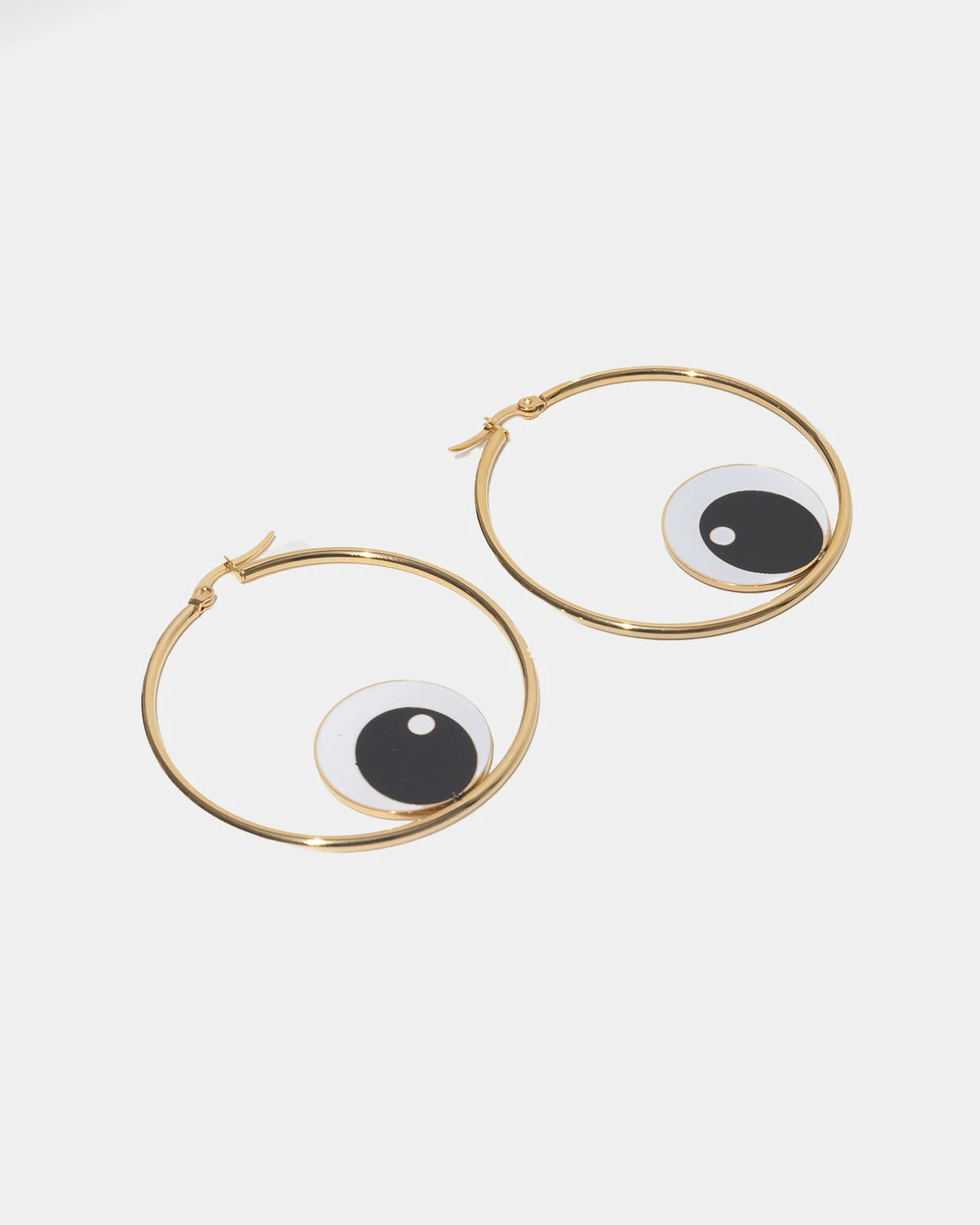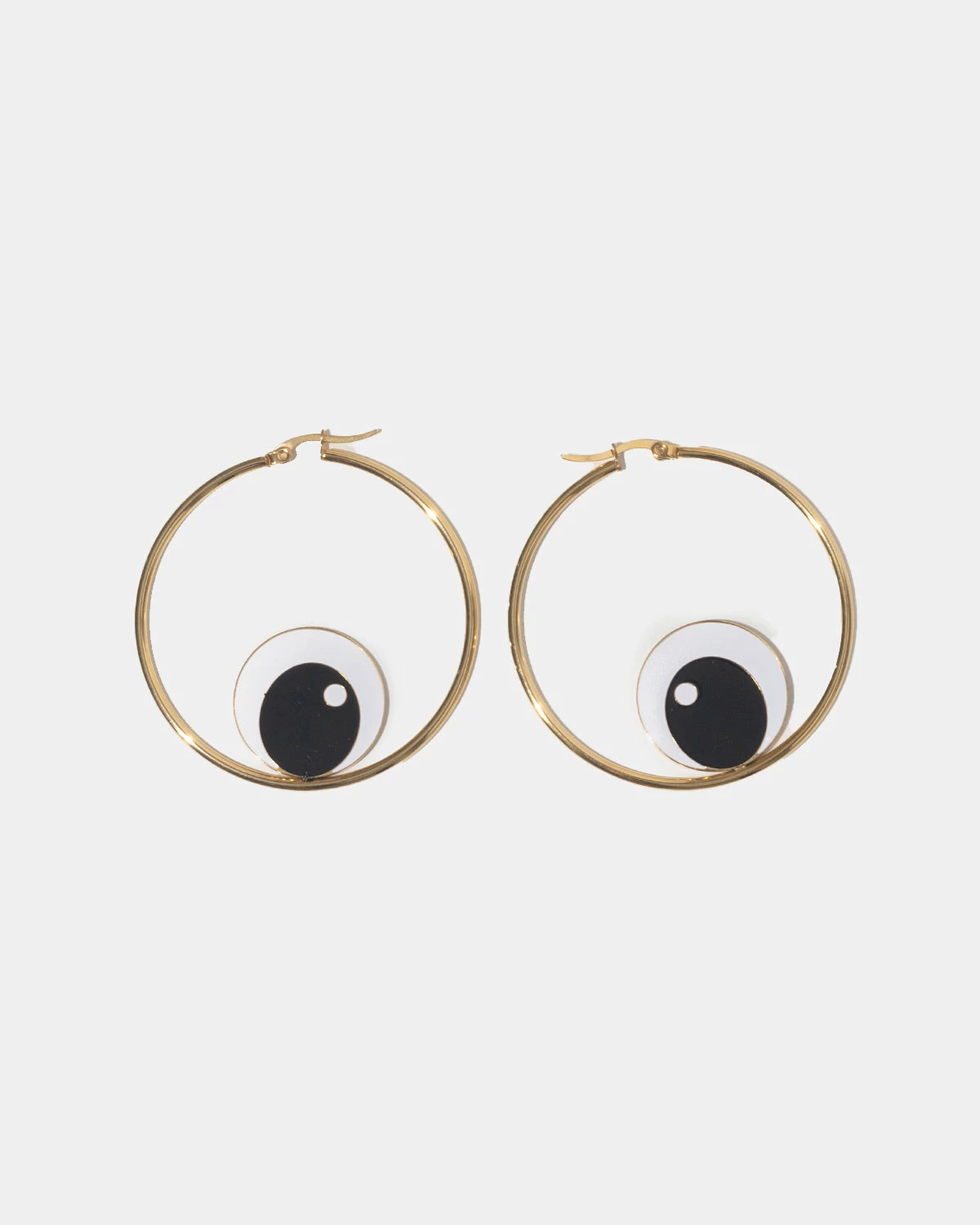 Details: Perfect universal size hoop earrings, metallic gold leather with cartoon eyes.