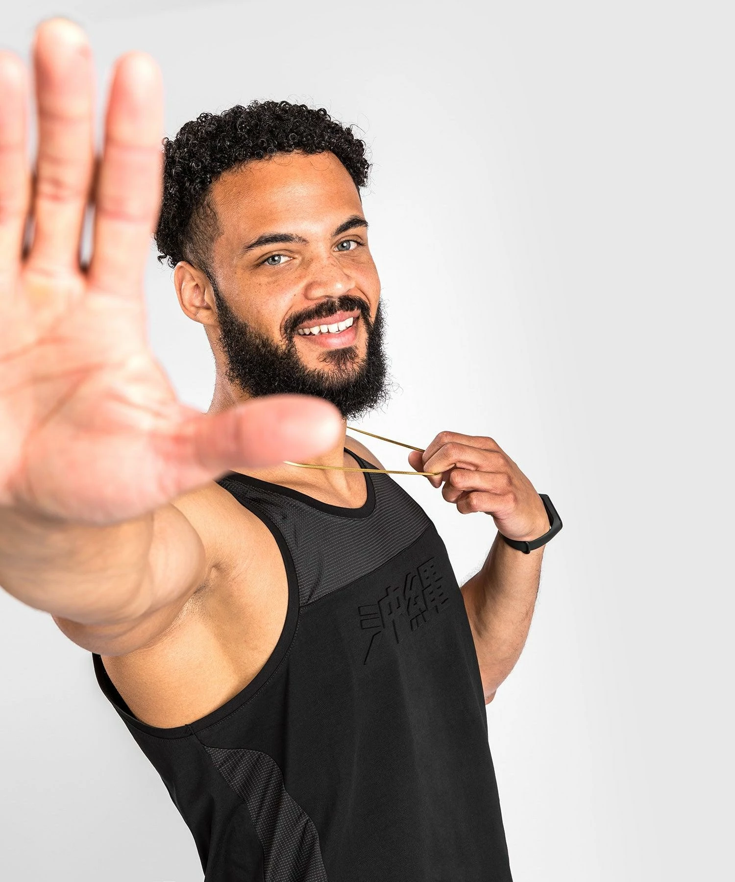 The tank top features stylized Japanese text reading “Okinawa” on the front and back. The Okinawa 3.0 range refers to the island of Okinawa, widely considered as the birthplace Japanese martial arts.